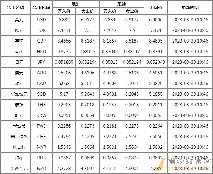 2023年3月29日银行间外汇市场人民币汇率中间价为:1美元对人民币6.8771元,1欧元对人民币7.4551元,100日元对人民币5.2484元,1港元对人民币0.87610元,1英镑对人民币8.4804元,1澳大利亚元对人民币4.6101元,1新西兰元对人民币4.2989元,1新加坡元对人民币5.1792元,1瑞士法郎对人民币7.4699元,1加拿大元对人民币5.0582元,人民币1元对0.63918马来西亚林吉特,人民币1元对11.1700俄罗斯卢布,人民币1元对2.6379南非兰特,人民币1元对188.71韩元,人民币1元对0.53396阿联酋迪拉姆,人民币1元对0.54601沙特里亚尔,人民币1元对51.1032匈牙利福林,人民币1元对0.62747波兰兹罗提,人民币1元对0.9993丹麦克朗,人民币1元对1.5059瑞典克朗,人民币1元对1.5066挪威克朗,人民币1元对2.78030土耳其里拉,人民币1元对2.6512墨西哥比索,人民币1元对4.9791泰铢。