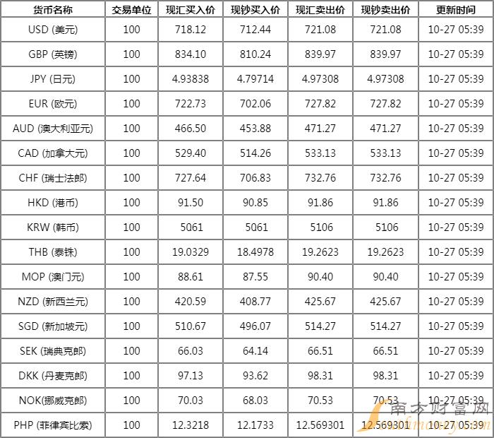 10月27日,人民币对美元中间价上调68个基点,报7.1570。人民币16:30收盘价报7.1825,23:30夜盘收报7.1710。