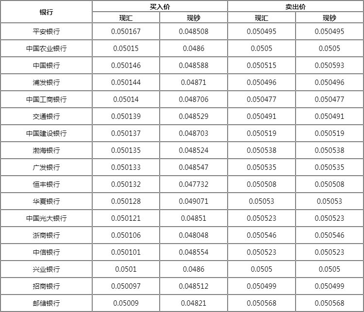 1日元=0.05032人民币