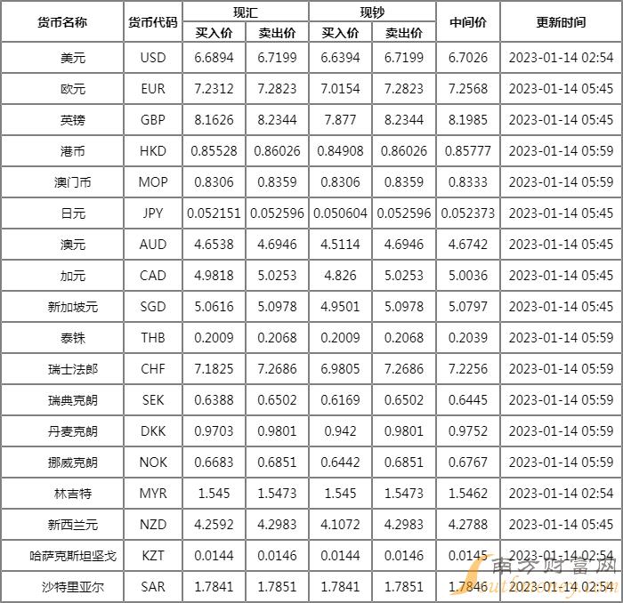 傅光 2023年中信银行外汇牌价表 1月14日中信银行人民币汇率多少,下面同大耳朵来看看。