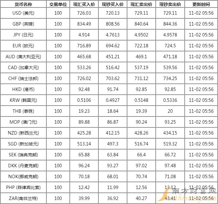 傅光 中国银行外汇牌价表一览 11月2日中行人民币汇率走势?下面同小宋来看看。