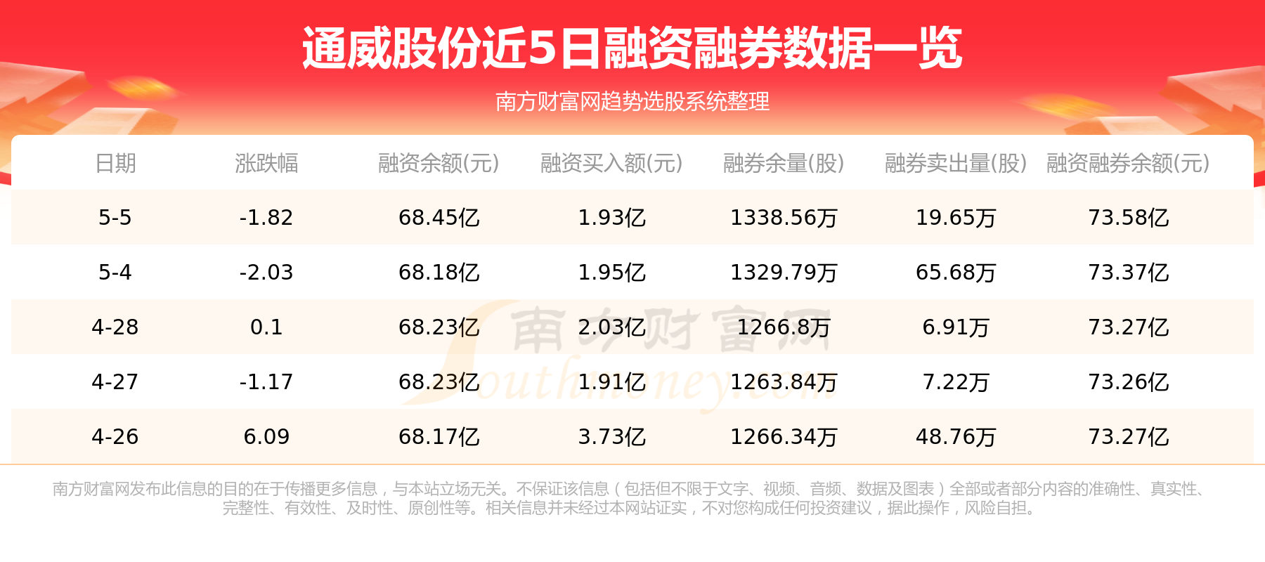 5月5日通威股份融券信息显示,融资方面,当日融资买入1.93亿元,融资偿还1.67亿元,融资净买额2643.81万元。融券方面,融券卖出19.65万股,融券偿还10.88万股,融券余量1338.56万股,融券余额5.13亿元。融资融券余额73.58亿元。近5日融资融券数据一览见下表: