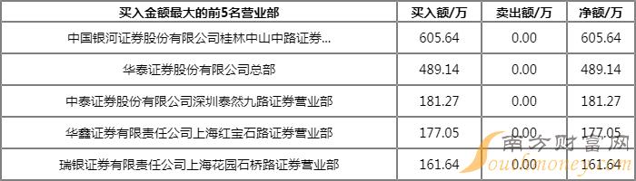 今日上榜营业部中,第一大买入营业部为中国银河证券股份有限公司桂林中山中路证券营业部,买入金额为605.64万元,第一大卖出营业部为中信建投证券股份有限公司上海浦东新区福山路证券营业部,卖出金额为609.04万元。