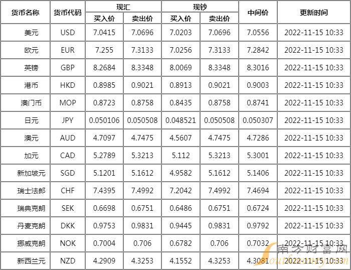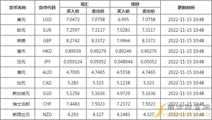 11月15日,人民币兑美元中间价报7.0421,调升478个基点,创2022年9月26日以来最高;前一交易日中间价报7.0899,人民币16:30收盘价报7.0378,23:30夜盘收报7.0710。