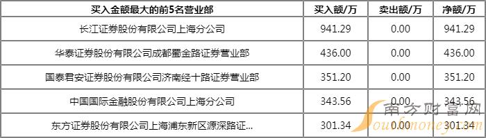 上榜的前五大买卖营业部合计成交4050.76万元, 其中,买入成交额为2373.38万元,卖出成交额为1677.38万元,合计净买入695.99万元。具体来看,今日上榜营业部中,第一大买入营业部为长江证券股份有限公司上海分公司,买入金额为941.29万元,其次是华泰证券股份有限公司成都蜀金路证券营业部,买入金额436.00万元。卖出营业部中,卖出金额居首的是银泰证券有限责任公司上海静安区长安路证券营业部,卖出金额为613.55万元。