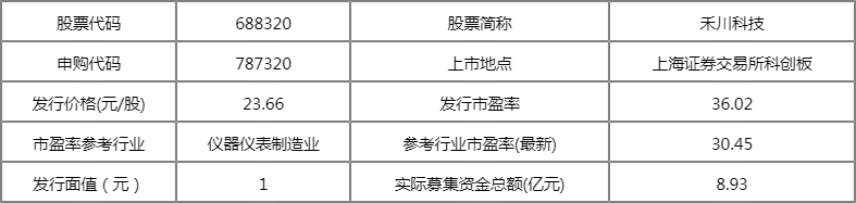 禾川科技发行总数约3776万股,发行市盈率36.02倍,申购代码为:787320,申购价格:23.66元,单一账户申购上限0.95万股,申购数量500股整数倍。