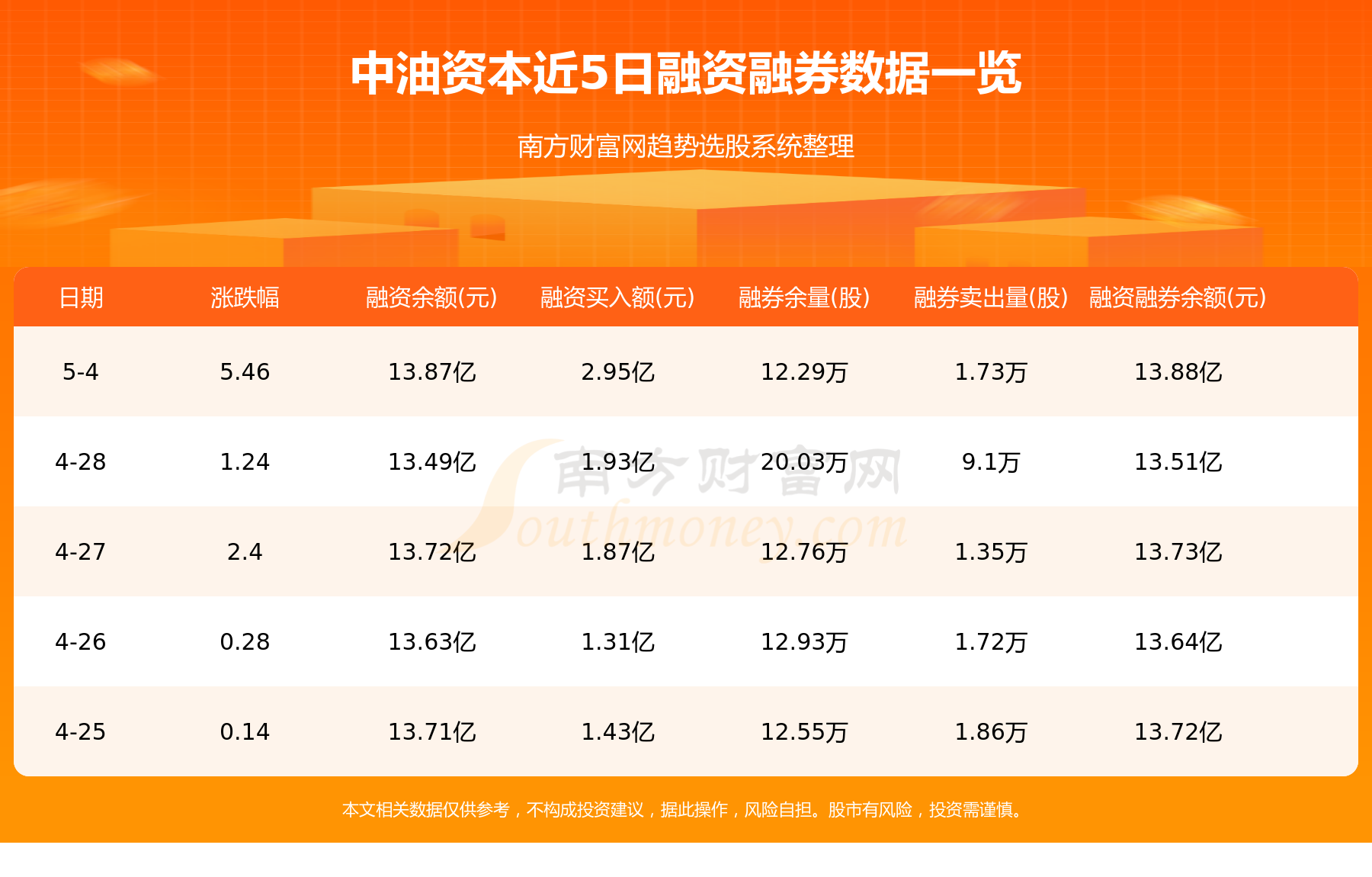 5月4日中油资本融券信息显示,融资方面,当日融资买入2.95亿元,融资偿还2.57亿元,融资净买额3813.6万元。融券方面,融券卖出1.73万股,融券偿还9.47万股,融券余量12.29万股,融券余额95万元。融资融券余额13.88亿元。近5日融资融券数据一览见下表: