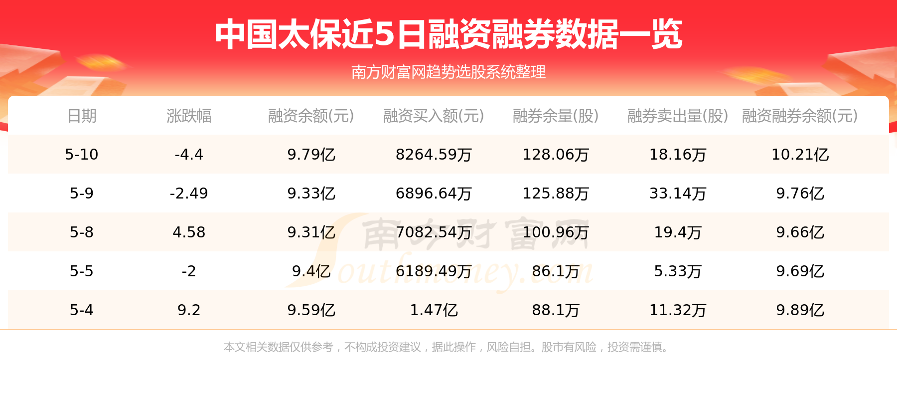 5月10日中国太保融券信息显示,融资方面,当日融资买入8264.59万元,融资偿还3611.4万元,融资净买额4653.19万元。融券方面,融券卖出18.16万股,融券偿还15.98万股,融券余量128.06万股,融券余额4169.61万元。融资融券余额10.21亿元。近5日融资融券数据一览见下表: