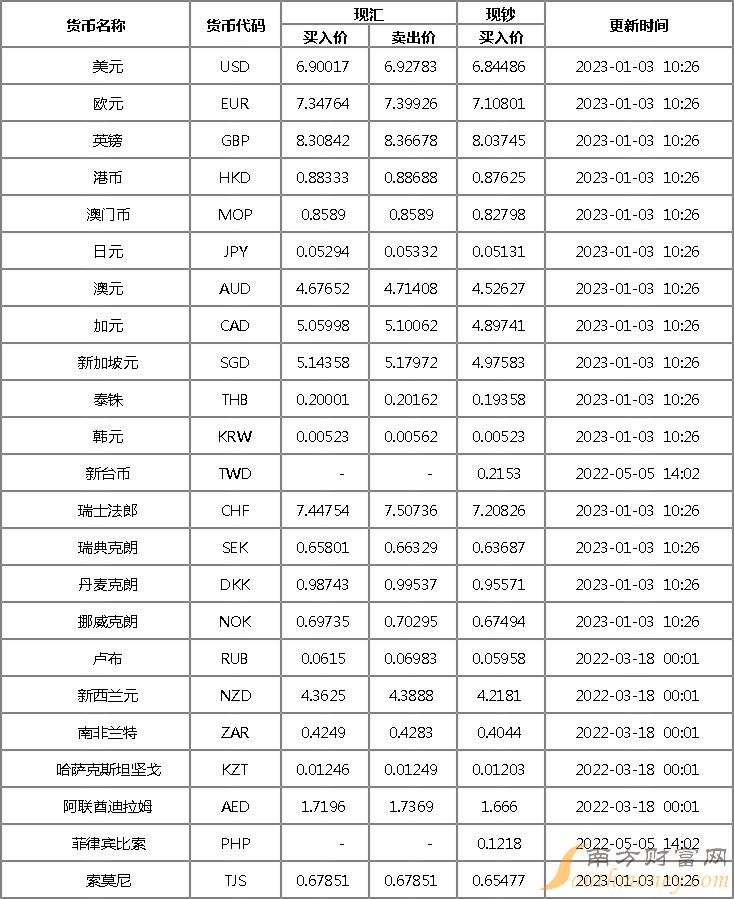 2022年12月28日银行间外汇市场人民币汇率中间价为:1美元对人民币6.9681元,1欧元对人民币7.4090元,100日元对人民币5.2183元,1港元对人民币0.89328元,1英镑对人民币8.3774元,1澳大利亚元对人民币4.6875元,1新西兰元对人民币4.3683元,1新加坡元对人民币5.1707元,1瑞士法郎对人民币7.4963元,1加拿大元对人民币5.1530元,人民币1元对0.63509马来西亚林吉特,人民币1元对9.9636俄罗斯卢布,人民币1元对2.4704南非兰特,人民币1元对182.46韩元,人民币1元对0.52712阿联酋迪拉姆,人民币1元对0.53943沙特里亚尔,人民币1元对54.1121匈牙利福林,人民币1元对0.63166波兰兹罗提,人民币1元对1.0038丹麦克朗,人民币1元对1.5033瑞典克朗,人民币1元对1.4100挪威克朗,人民币1元对2.68086土耳其里拉,人民币1元对2.7956墨西哥比索,人民币1元对4.9684泰铢。