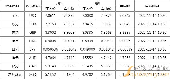 11月15日,人民币兑美元中间价报7.0421,调升478个基点,创2022年9月26日以来最高;前一交易日中间价报7.0899,人民币16:30收盘价报7.0378,23:30夜盘收报7.0710。