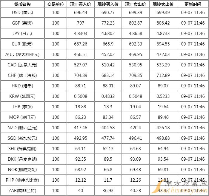 乌黑眸子的舒 中国银行外汇牌价 9月7日中行人民币汇率多少?下面同小红帽来看看。