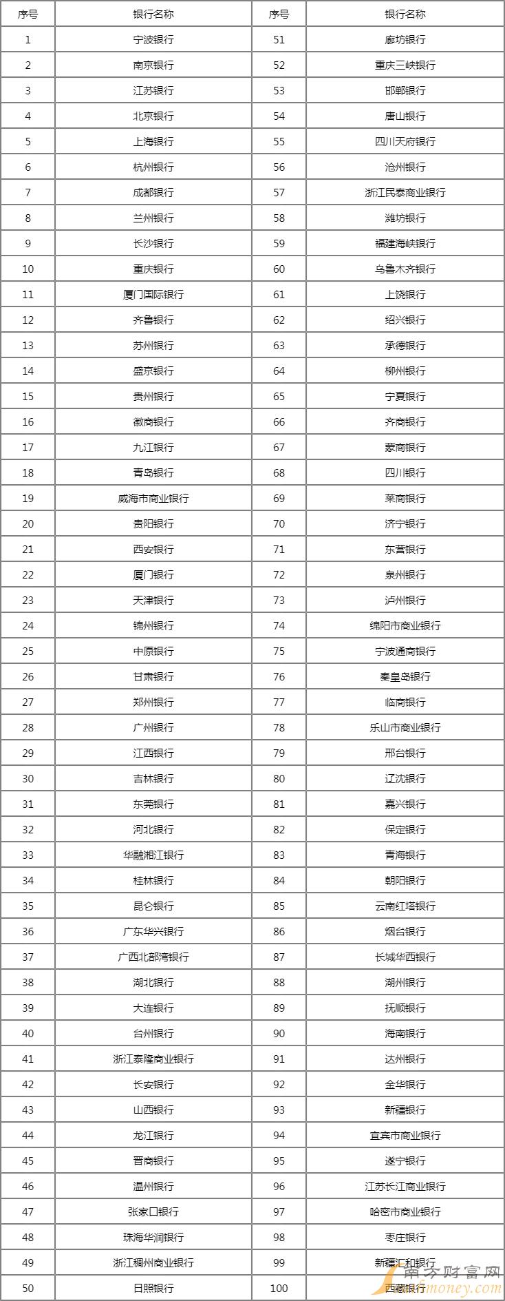 中国共计有128家城市商业银行,营业网点近万个,遍及全国各个省(市、自治区),是中国银行业的重要组成部分。其中宁波银行、南京银行、江苏银行、北京银行、上海银行位列榜单前五强。