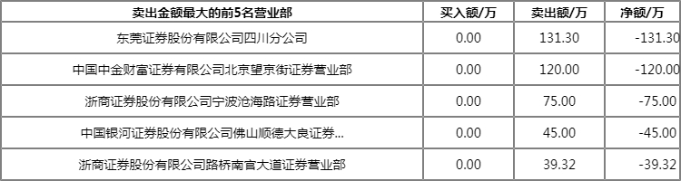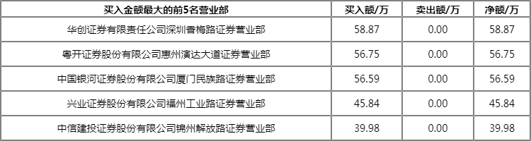 今日上榜营业部中,第一大买入营业部为华创证券有限责任公司深圳香梅路证券营业部,买入金额为58.87万元,第一大卖出营业部为东莞证券股份有限公司四川分公司,卖出金额为131.30万元。