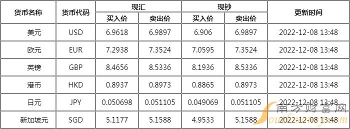 12月8日,2022年12月8日银行间外汇市场人民币汇率中间价为:1美元对人民币6.9606元,前一交易日中间价报6.9975元,单日调升369基点。