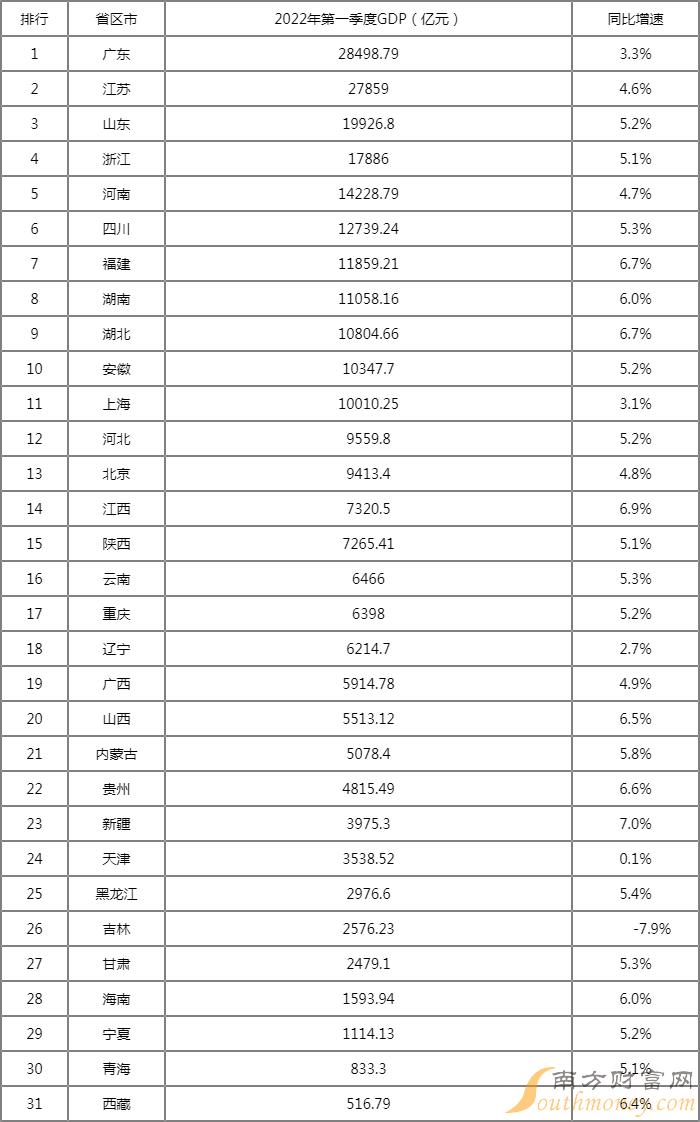小蓝眼睛的伏特加 统计局公布了2022年一季度国内生产总值情况,同时,全国各省份也相继披露了2022年一季度经济运行数据。其中广东省以28498.79亿元GDP继续领跑全国,江苏省以27859亿元紧随其后,山东省以19926.8亿元排在全国第三。