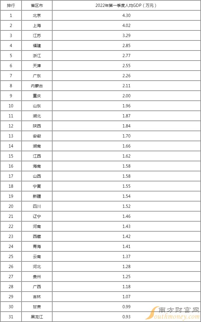 从一季度全国各省人均收入来看,北京和上海一季度人均GDP突破4万元,江苏、福建、浙江、天津、广东、内蒙古、重庆6省份一季度人均GDP达到2万元。