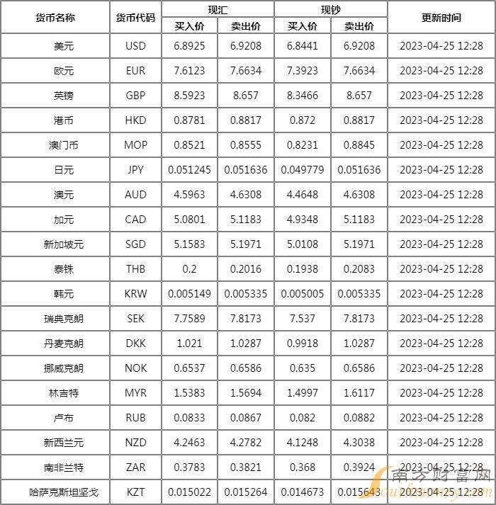 2023年4月25日银行间外汇市场人民币汇率中间价为:1美元对人民币6.8847元,1欧元对人民币7.6109元,100日元对人民币5.1357元,1港元对人民币0.87715元,1英镑对人民币8.6039元,1澳大利亚元对人民币4.6133元,1新西兰元对人民币4.2500元,1新加坡元对人民币5.1654元,1瑞士法郎对人民币7.7611元,1加拿大元对人民币5.0868元,人民币1元对0.64266马来西亚林吉特,人民币1元对11.8274俄罗斯卢布,人民币1元对2.6361南非兰特,人民币1元对193.35韩元,人民币1元对0.53333阿联酋迪拉姆,人民币1元对0.54477沙特里亚尔,人民币1元对49.3640匈牙利福林,人民币1元对0.60426波兰兹罗提,人民币1元对0.9793丹麦克朗,人民币1元对1.4878瑞典克朗,人民币1元对1.5288挪威克朗,人民币1元对2.81783土耳其里拉,人民币1元对2.6117墨西哥比索,人民币1元对4.9834泰铢。