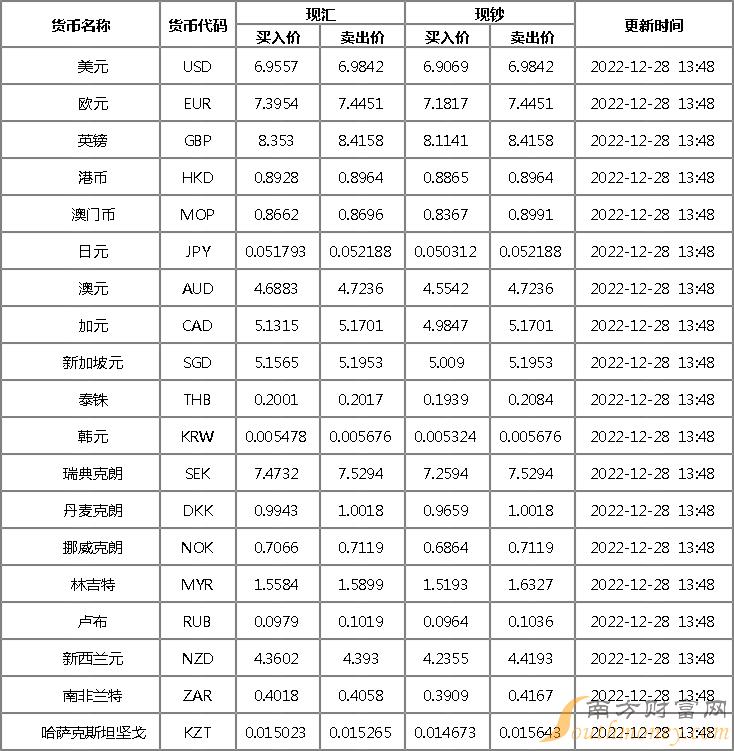 2022年12月28日银行间外汇市场人民币汇率中间价为:1美元对人民币6.9681元,1欧元对人民币7.4090元,100日元对人民币5.2183元,1港元对人民币0.89328元,1英镑对人民币8.3774元,1澳大利亚元对人民币4.6875元,1新西兰元对人民币4.3683元,1新加坡元对人民币5.1707元,1瑞士法郎对人民币7.4963元,1加拿大元对人民币5.1530元,人民币1元对0.63509马来西亚林吉特,人民币1元对9.9636俄罗斯卢布,人民币1元对2.4704南非兰特,人民币1元对182.46韩元,人民币1元对0.52712阿联酋迪拉姆,人民币1元对0.53943沙特里亚尔,人民币1元对54.1121匈牙利福林,人民币1元对0.63166波兰兹罗提,人民币1元对1.0038丹麦克朗,人民币1元对1.5033瑞典克朗,人民币1元对1.4100挪威克朗,人民币1元对2.68086土耳其里拉,人民币1元对2.7956墨西哥比索,人民币1元对4.9684泰铢。