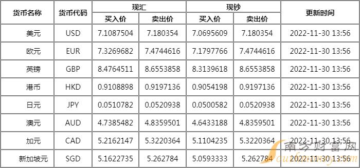 11月29日,人民币兑美元中间价报7.1989,下调372点;上一交易日中间价7.1617,上一交易日收盘价7.1999,上日夜盘报收7.2066。
