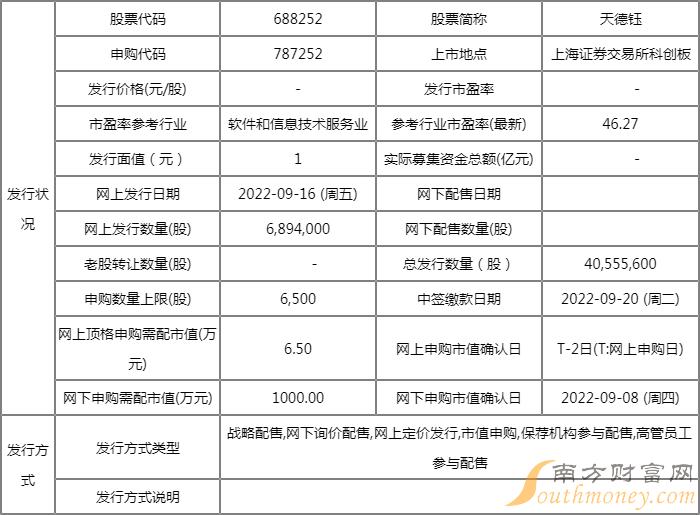 深圳天德钰科技股份有限公司将于9月16日开启新股申购,股票简称为天德钰,申购代码为787252,股票代码为687252,发行价还未得知。