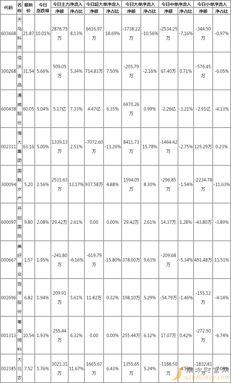 水产养殖主力净流入5.9970亿元,涨幅2.18%,天马科技领涨10.01%,16家上市公司上涨。