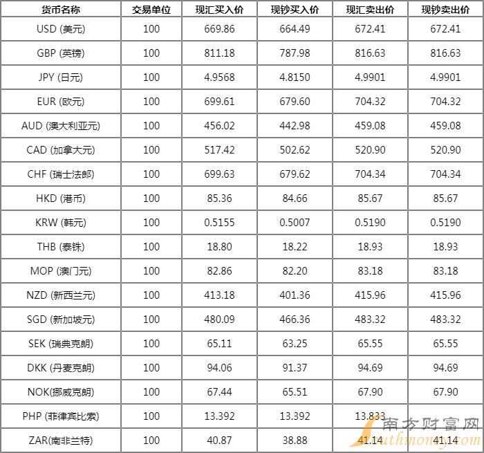 1美元对人民币6.6863元,1欧元对人民币7.0067元,100日元对人民币4.9239元,1港元对人民币0.85208元,1英镑对人民币8.1321元,1澳大利亚元对人民币4.6138元,1新西兰元对人民币4.1722元,1新加坡元对人民币4.8119元,1瑞士法郎对人民币7.0016元,1加拿大元对人民币5.1949元,人民币1元对0.65877马来西亚林吉特,人民币1元对8.1538俄罗斯卢布,人民币1元对2.4362南非兰特,人民币1元对192.72韩元,人民币1元对0.54908阿联酋迪拉姆,人民币1元对0.56093沙特里亚尔,人民币1元对56.5751匈牙利福林,人民币1元对0.67044波兰兹罗提,人民币1元对1.0613丹麦克朗,人民币1元对1.5304瑞典克朗,人民币1元对1.4724挪威克朗,人民币1元对2.49599土耳其里拉,人民币1元对3.0071墨西哥比索,人民币1元对5.2791泰铢。