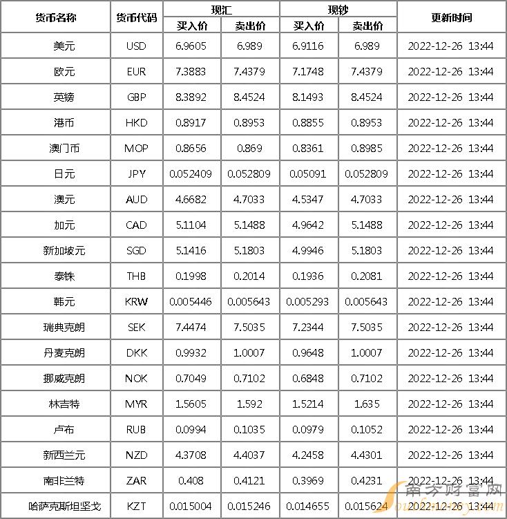 2022年12月27日银行间外汇市场人民币汇率中间价为:1美元对人民币6.9546元,1欧元对人民币7.4007元,100日元对人民币5.2391元,1港元对人民币0.89139元,1英镑对人民币8.4003元,1澳大利亚元对人民币4.6902元,1新西兰元对人民币4.3831元,1新加坡元对人民币5.1618元,1瑞士法郎对人民币7.4621元,1加拿大元对人民币5.1273元,人民币1元对0.63571马来西亚林吉特,人民币1元对9.8558俄罗斯卢布,人民币1元对2.4501南非兰特,人民币1元对183.18韩元,人民币1元对0.52806阿联酋迪拉姆,人民币1元对0.54074沙特里亚尔,人民币1元对54.0658匈牙利福林,人民币1元对0.62721波兰兹罗提,人民币1元对1.0050丹麦克朗,人民币1元对1.5091瑞典克朗,人民币1元对1.4141挪威克朗,人民币1元对2.68532土耳其里拉,人民币1元对2.7850墨西哥比索,人民币1元对4.9818泰铢。