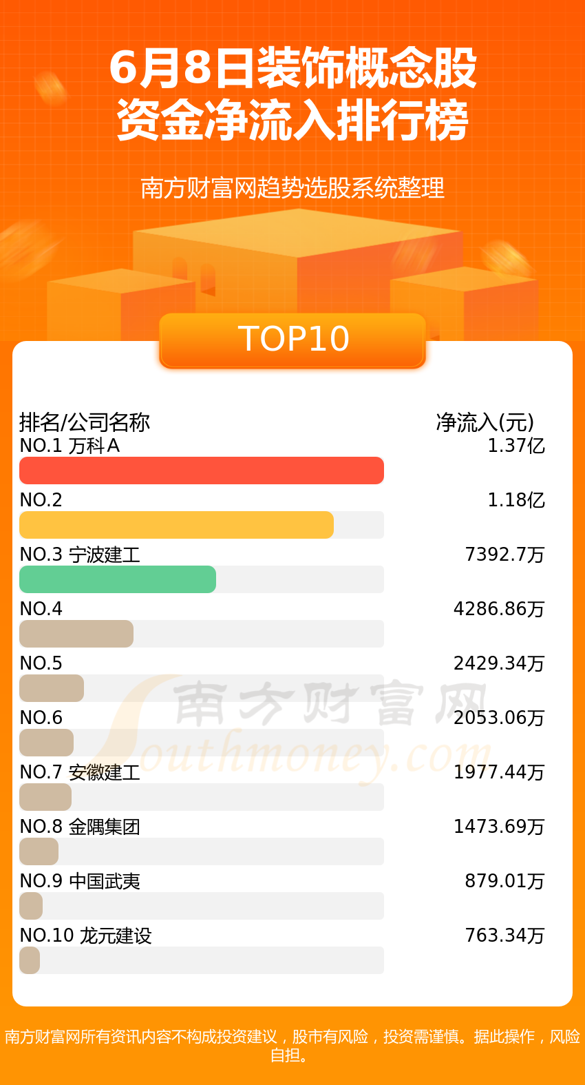 装饰概念股6月8日资金净流入情况来看,万科A位列第一位,主力净流入达到1.37亿元;兔宝宝排名第二,主力净流入为1.18亿元;宁波建工排名第三,主力净流入7392.7万元。主力净流入排名前10的还有:宝鹰股份、丝路视觉、中装建设、安徽建工、金隅集团、中国武夷、龙元建设。