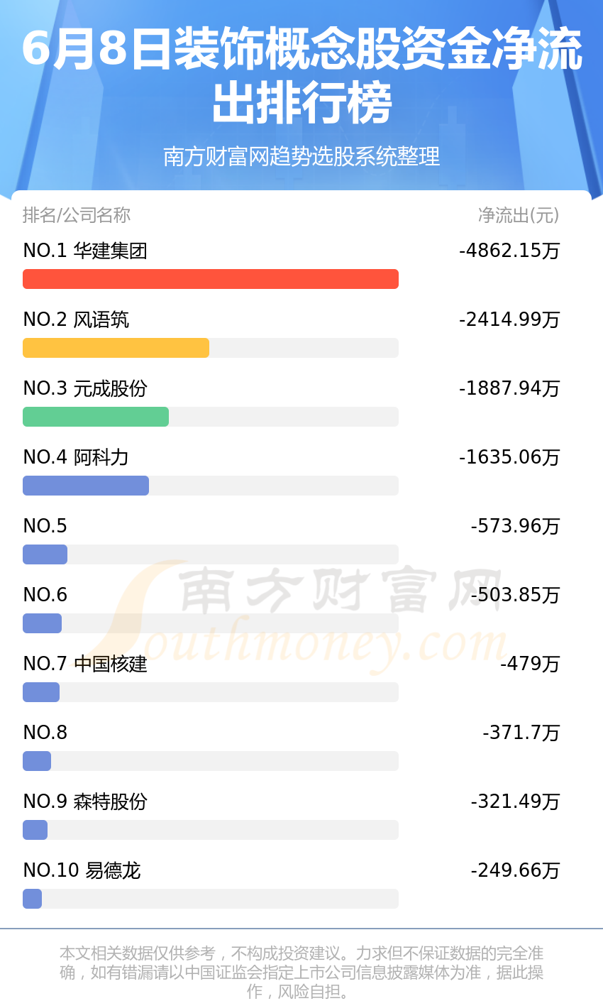 装饰概念股6月8日资金净流出情况来看,华建集团位列第一位,主力净流出达到-4862.15万元;风语筑排名第二,主力净流出为-2414.99万元;元成股份排名第三,主力净流出-1887.94万元。主力净流出排名前10的还有:阿科力、亚厦股份、正威新材、中国核建、海南发展、森特股份、易德龙。