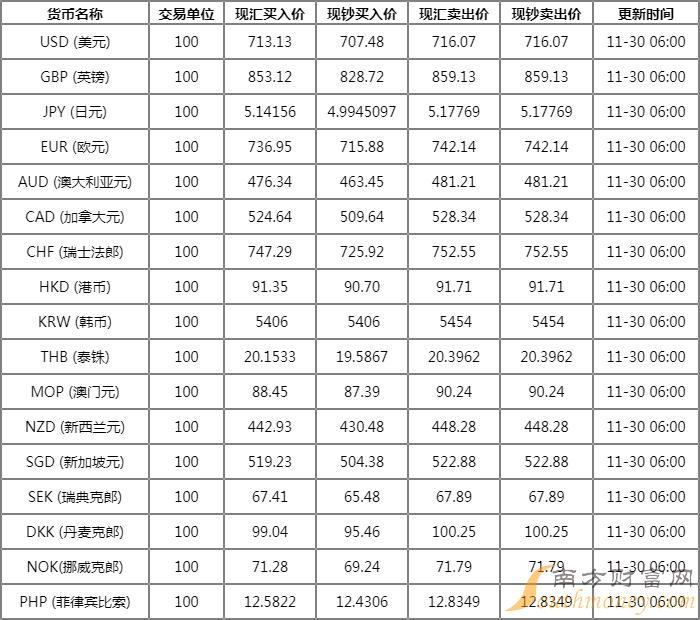整洁的婉 浦发银行外汇牌价表11月30日浦发银行人民币汇率是多少?下面同小蔡来看看。