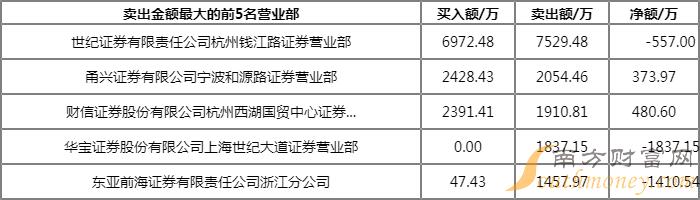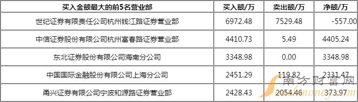 具体来看,中信证券杭州富春路证券营业部、东北证券海南分公司分别买入4410.73万元、3348.98万元;卖出方面,世纪证券杭州钱江路证券营业部、甬兴证券有限公司宁波和源路证券营业部分别卖出7529.48万元、2054.46万元。