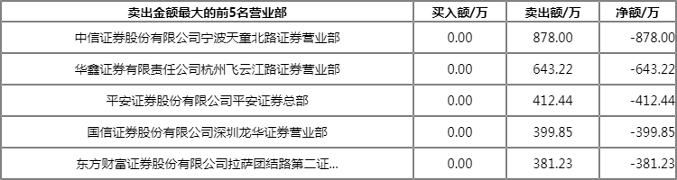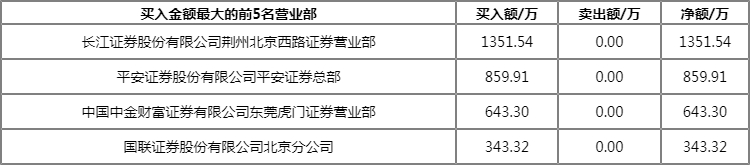 今日上榜营业部中,第一大买入营业部为长江证券股份有限公司荆州北京西路证券营业部,买入金额为1351.54万元,第一大卖出营业部为中信证券股份有限公司宁波天童北路证券营业部,卖出金额为878.01万元。