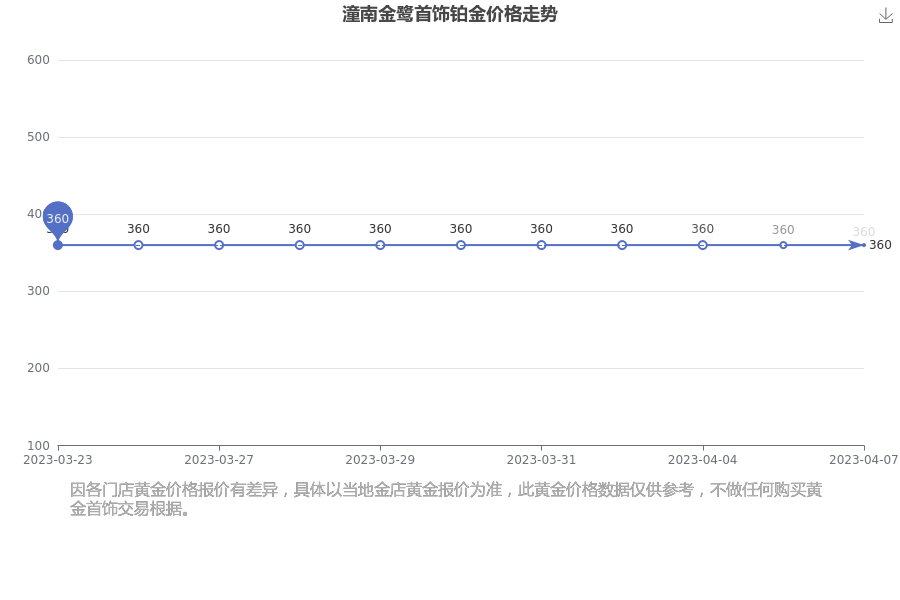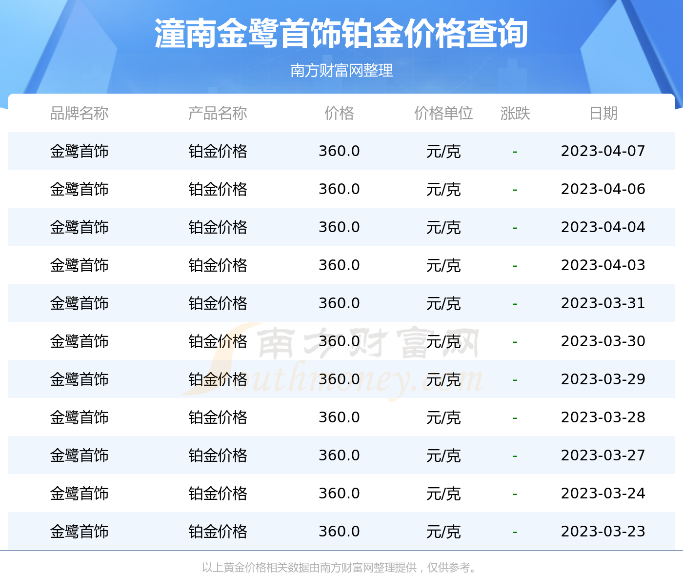 今日(2023年4月7日)潼南金鹭首饰铂金价格:360.0元/克。