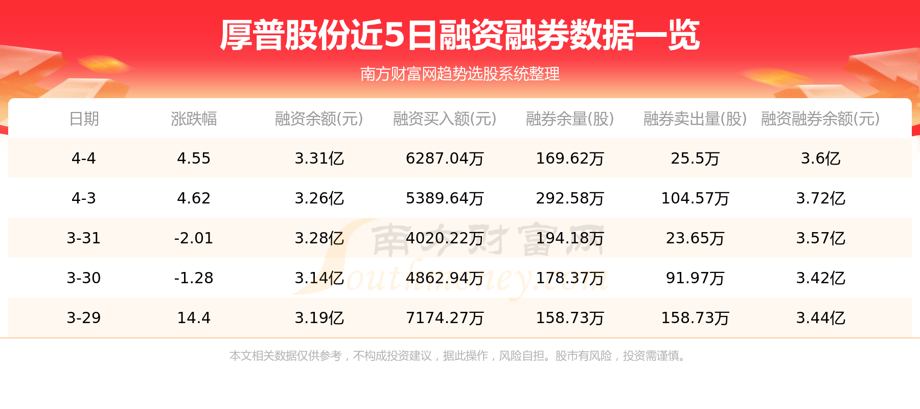 厚普股份4月4日融券信息显示,融资方面,当日融资买入6287.04万元,融资偿还5696.55万元,融资净买额590.5万元。融券方面,融券卖出25.5万股,融券偿还148.46万股,融券余量169.62万股,融券余额2808.91万元。融资融券余额3.6亿元。近5日融资融券数据一览见下表: