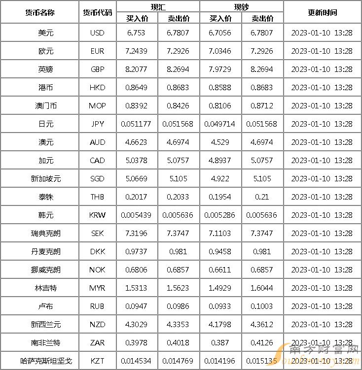 2023年1月10日银行间外汇市场人民币汇率中间价为:1美元对人民币6.7611元,1欧元对人民币7.2549元,100日元对人民币5.1297元,1港元对人民币0.86585元,1英镑对人民币8.2355元,1澳大利亚元对人民币4.6709元,1新西兰元对人民币4.3053元,1新加坡元对人民币5.0813元,1瑞士法郎对人民币7.3401元,1加拿大元对人民币5.0491元,人民币1元对0.64686马来西亚林吉特,人民币1元对10.3113俄罗斯卢布,人民币1元对2.5073南非兰特,人民币1元对183.45韩元,人民币1元对0.54326阿联酋迪拉姆,人民币1元对0.55562沙特里亚尔,人民币1元对54.7101匈牙利福林,人民币1元对0.64690波兰兹罗提,人民币1元对1.0252丹麦克朗,人民币1元对1.5386瑞典克朗,人民币1元对1.4647挪威克朗,人民币1元对2.77396土耳其里拉,人民币1元对2.8316墨西哥比索,人民币1元对4.9451泰铢。