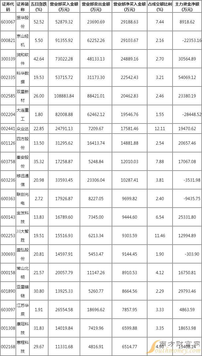 近五个交易日登陆沪深两市的龙虎榜个股中,营业部净买入较大的个股有振华股份、京山轻机、润和软件。具体来看,振华股份是资金最青睐个股,营业部净买入金额达2.92亿元,高居榜首。此外,京山轻机营业部净买入金额也排名居前。