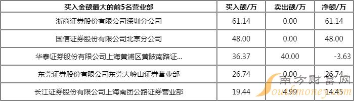 今日上榜营业部中,第一大买入营业部为浙商证券股份有限公司深圳分公司,买入金额为61.14万元,第一大卖出营业部为国金证券股份有限公司成都武成大街证券营业部,卖出金额为44.43万元。