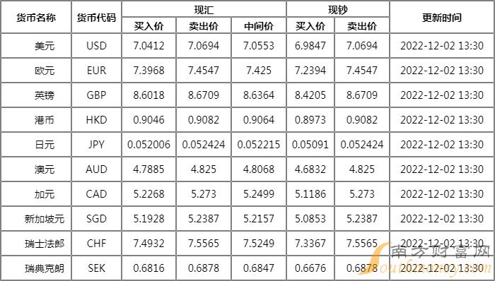 12月2日人民币兑美元中间价报7.0542,上调683个基点。前一交易日中间价报7.1225,人民币16:30收盘价报7.0791,23:30夜盘收报7.0550。