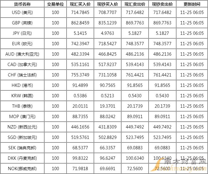 柯保 中国银行外汇牌价表 11月24日中行人民币汇率多少?下面同富贵君来看看。