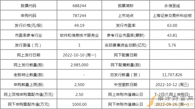 北京永信至诚科技股份有限公司将上海证券交易所科创板上市,上市申购时间为2022年10月10日,其股票代码688244,上市发行价:49.19元/股,总发行数量11,707,826股。