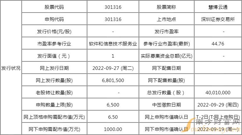 2022年9月29日创业板慧博云通将公布新股中签结果。