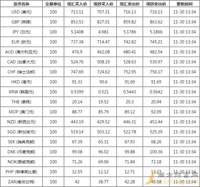 唇无血色的路灯 中国银行外汇牌价表11月30日中国银行人民币汇率是多少?下面同路路来看看。