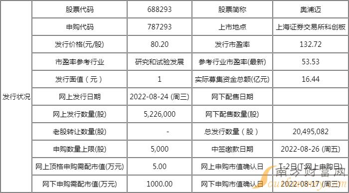 上海奥浦迈生物科技股份有限公司将上海证券交易所科创板上市,上市申购时间为2022年8月24日,其股票代码688293,上市发行价:80.20元/股,总发行数量20,495,082股。