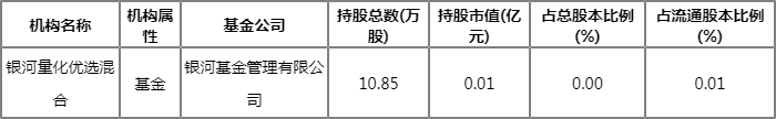 根据2022Q1季报公募基金重仓股数据,重仓该股的公募基金共1家,其中持有数量最多的公募基金为银河量化优选混合。银河量化优选混合目前规模为0.3亿元。