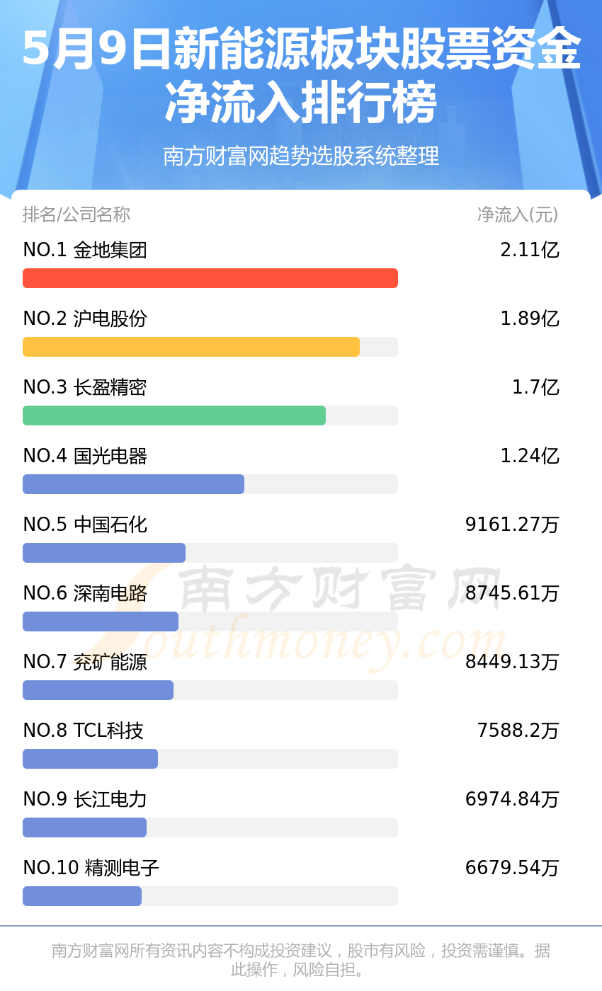 双目传神的竹笋 新能源板块股票5月9日资金净流入情况来看,金地集团位列第一位,主力净流入达到2.11亿元;沪电股份排名第二,主力净流入为1.89亿元;长盈精密排名第三,主力净流入1.7亿元。主力净流入排名前10的还有:国光电器、中国石化、深南电路、兖矿能源、TCL科技、长江电力、精测电子。