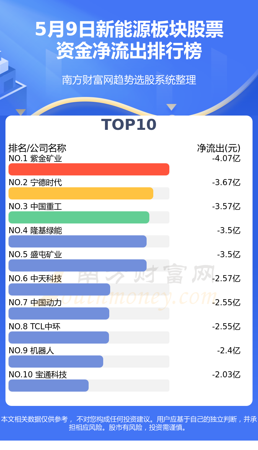 新能源板块股票5月9日资金净流出情况来看,紫金矿业位列第一位,主力净流出达到-4.07亿元;宁德时代排名第二,主力净流出为-3.67亿元;中国重工排名第三,主力净流出-3.57亿元。主力净流出排名前10的还有:隆基绿能、盛屯矿业、中天科技、中国动力、TCL中环、机器人、宝通科技。