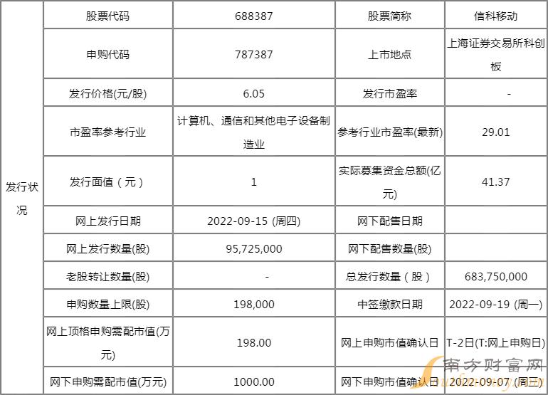 信科移动申购代码787387,申购价格6.05元,网上发行9573万股;信科移动网上单一账户申购上限19.80万股,网上顶格申购需配置沪市市值198万元。