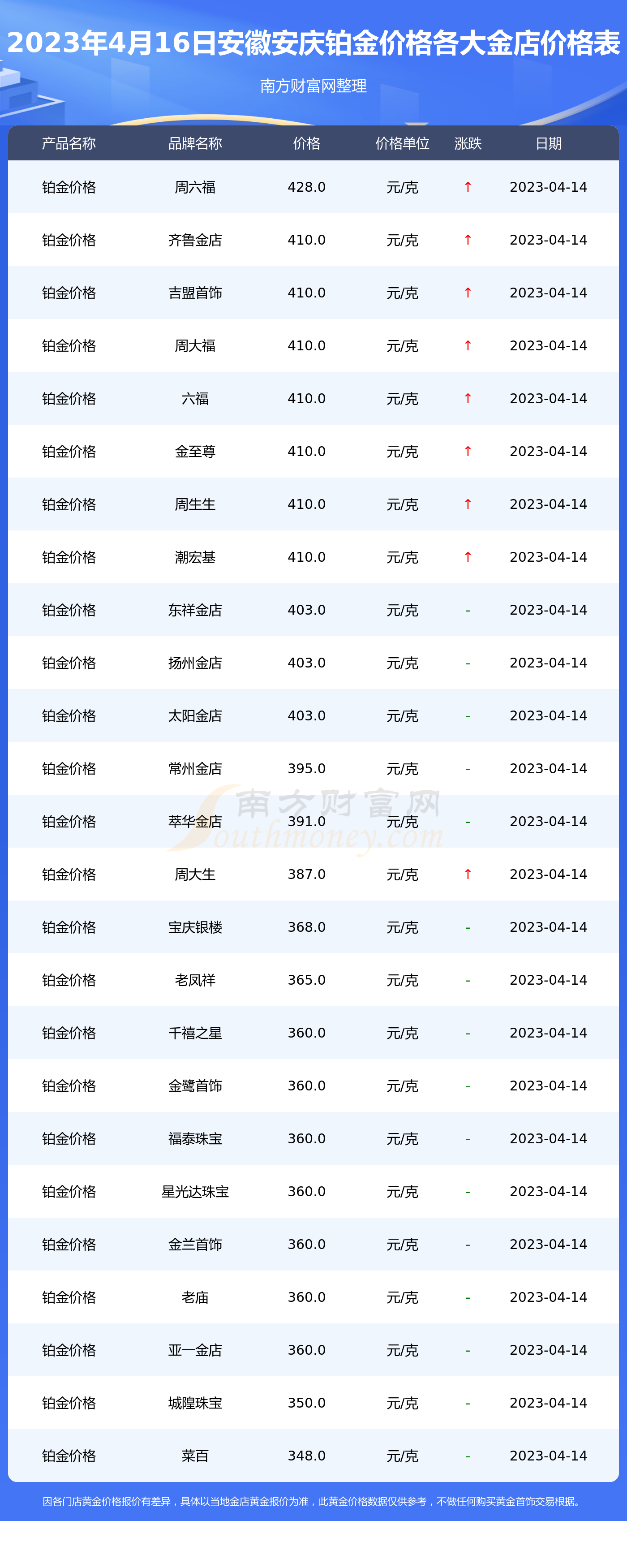 两鬓雪白的石榴 2023年4月18日,重庆菜百、富艺珠宝等各大金店品牌PT990铂金今日价格如下:菜百352.0元/克、富艺珠宝383.0元/克。
