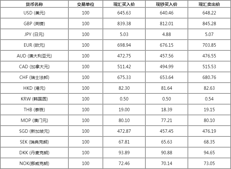 本牌价仅供参考,以人民银行各分行实际交易汇率为准。